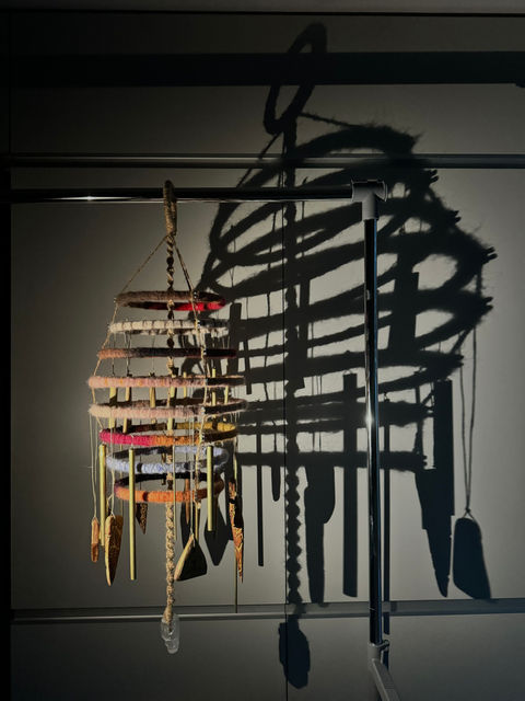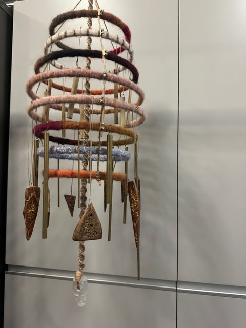 Wood, wool, string, bamboo, copper, acrylic and selenite. 25 x 25 x 80 cm